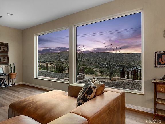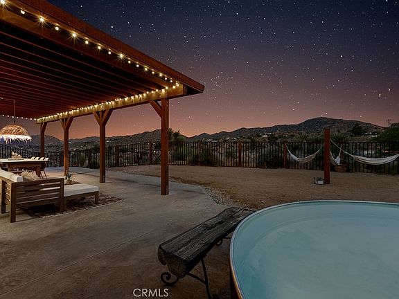 LUXURY MODERN SOUTHWEST RETREAT located on the west end of Yucca Valley. This custom home was built to capture the spectacular mountain views from every window. No details were overlooked in the professional design of this modern home. Some of the many features include a recently upgraded kitchen and guest bathroom, luxury vinyl plank flooring throughout, quartz countertops, American Clay wall finishes, designer lighting, custom beam, primary suite accent wall, newer hot tub, 10 foot cowboy pool, finished two car garage, and custom built furnishings in bedroom and dining areas. The custom steel fence was welded in place to follow the natural desert terrain. Set up to enjoy outdoor living...the private 8 ft spa sits overlooking the city lights and golf course with a custom bar top for gathering and enjoying the view, the sunken fire pit area is protected from the elements and soaked in stars at night, lounge in a hammock, soak in the cowboy pool or dine al fresco under the large rustic covered patio. Solar was installed in 2021 and maintains a credit with SCE. There is much room to explore on this one acre property. Comes fully furnished and turn key. This is one of the most beautiful and peaceful homes and settings in Yucca Valley. The views will take your breath away. You don't want to miss it. Schedule your private showing today.