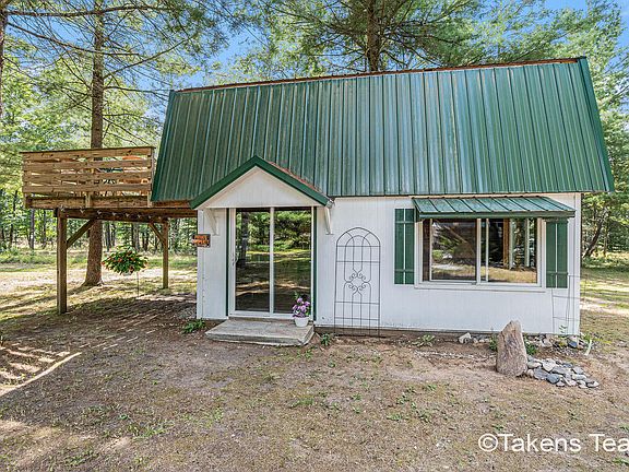 Your own personal retreat, feels like the beautiful Shrine of the Pines in the woods!Lovely residence or perfect cabin up north on 4.82 acres! Custom made woodworking throughout home. The main house offers 2 bedrooms, 2 full bathrooms, approx 1625 sq.ft. approx 189 sq. ft in basement. Metal roof.Primary Bedroom has Primary bathroom with tub, Laundry room. Kitchen has snack bar area and dining room. Large living room with pellet stove. Vaulted ceiling. Sitting area has wet bar. 2nd bedroom has a full bath with shower. Propane heaters each bedroom. Home has shingled roof porch and deck off primary bedroom. Secondary home in back as in law suite or guest house with kitchen, dining area, living room, upper bedroom,balcony. Large 24 x 40 pole barn has workshop, sheds, private shooting range!