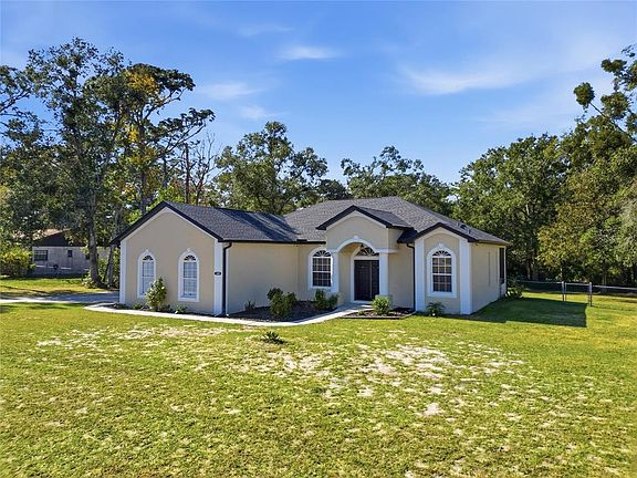Welcome to this beautiful, move-in ready three-bedroom, two-bath home situated on over half an acre of corner-lot privacy. Fresh interior and exterior paint, a new roof (2025), new hot water heater (2025) and new garage door opener, provide peace of mind from day one. Step inside to a spacious open floor plan that immediately impresses. The formal dining and living area features plank-tile flooring, a ceiling fan, and a bright, inviting atmosphere with views of both the kitchen and backyard. This generous 15’ x 24’ space is perfect for everyday living and entertaining. The split floor plan places the primary suite on the north side of the home, offering direct access to the screened back porch. The en-suite bathroom includes a garden tub, walk-in shower, dual sinks, and a large walk-in closet. Two additional bedrooms—each with carpet and ceiling fans—are located on the south side of the home, separated by a full guest bathroom. Outside, the fully fenced 0.60-acre lot offers room to roam, play, and store your toys. You’ll find a storage shed equipped with electric and AC and a relaxing screened porch perfect for morning coffee or sunset unwinding. This home combines space, updates, and versatility—an incredible opportunity you won’t want to miss.