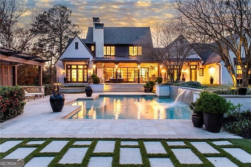 Set on one of the most beautiful lots in one of Atlanta's most desirable neighborhoods, this custom-built home by Mike Hammersmith blends classic architecture with refined, modern living skillfully curated by Greg Busch as featured in Atlanta Homes & Lifestyle magazine. As an early trendsetter, the painted antique brick fa ade, steep gables, and gas lanterns make a striking first impression, while the circular drive and pristine landscaping signal a home that's both luxurious and inviting. Inside, clean lines, natural textures, and expansive steel windows and doors create a light-filled, airy atmosphere. From the moment you enter, enjoy only the finest of details. The main living space is anchored by a dramatic stone fireplace and opens seamlessly to a chef's kitchen outfitted with top-tier appliances, custom cabinetry, and an oversized island made for gatherings. The adjoining dining room is framed by oversized windows and artful lighting, perfect for elegant entertaining or casual family dinners. Tucked off the main living area is a relaxed keeping room mixed with shiplap and exposed brick that adds space to unwind or entertain with built-in banquette seating. Ideal for laid-back meals, morning coffee and relaxation surrounded by the serene landscape. There's also a thoughtfully designed private study with custom built-ins and a quiet, inspiring vibe with a hidden door leading to the primary suite. Other main floor features include a stylish powder room, a private work nook or homework station, and a fully built-out mudroom with locker-style storage and a pool-ready changing hall just steps from the backyard. The primary suite on the main level is a private sanctuary with terrace access, a spa-style bath with dual vanities, marble shower, and a soaking tub positioned under soft natural light. Every finish-from the herringbone tile to the custom built-ins-has been chosen with quiet luxury in mind. Upstairs, four generously sized en suite bedrooms provide comfort and flexibility for family or guests. Each space is thoughtfully designed with walk-in closets, designer bathrooms, and plenty of natural light. A central loft adds a flexible space for homework, lounging, or gaming-whatever fits your lifestyle. A second laundry room upstairs adds convenience without compromise. The terrace level offers a full media room with exposed brick and industrial flair, plus a stylish kitchenette, an expansive rec room, gym, stage, hidden play lounge for the littles, bonus storage, third laundry room, and wine cellar potential-all perfect for entertaining, weekend sleepovers, or long-term visitors. The outdoor spaces are as intentional as the interiors-built for year-round enjoyment and effortless entertaining. A covered patio serves as an all-season extension of the home, complete with a cozy fireplace, TV, built-in heaters, and a full outdoor kitchen. Just off the patio, a dedicated dining area invites long alfresco meals and easy gatherings. The resort-style pool takes center stage, with serene water features, tanning ledges, and multiple lounge areas that feel more like a boutique retreat than a backyard. A shaded cabana offers additional space to relax, unwind, or host guests in comfort. Surrounding it all is mature, thoughtfully planned landscaping and a level turf lawn-ideal for play, pets, or simply enjoying the view. The wooded backdrop provides privacy and a peaceful connection to nature, elevating the outdoor experience into something truly special. Every inch of this home has been curated with intention-from layout to lighting, indoor spaces to outdoor escapes. It's more than move-in ready. It's built for the way you live.