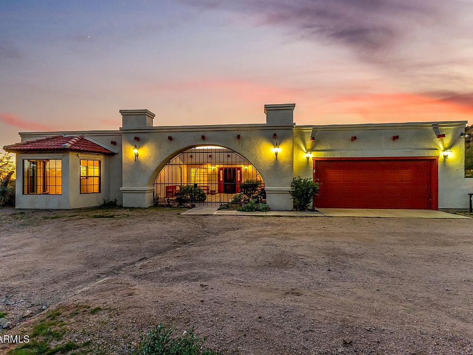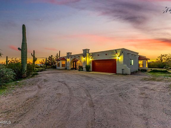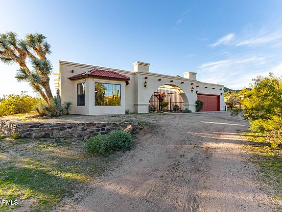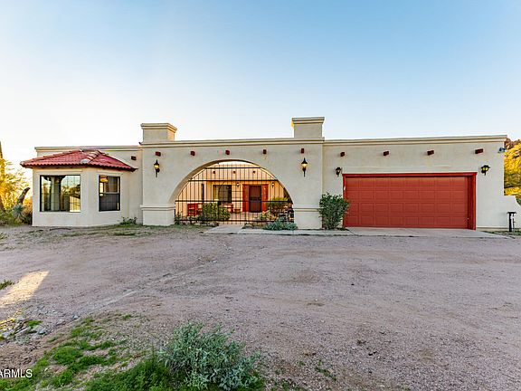 Welcome to this charming Santa Fe-style residence offering 2 bedrooms and 3 bathrooms, perfectly situated on an expansive 2.5-acre parcel with breathtaking 360-degree views near the serene Superstition Mountains. This thoughtfully updated home features fresh interior paint, new carpet, and upgraded luxury vinyl plank flooring in the kitchen area and primary bath. The property provides exceptional privacy and peaceful mountain vistas that truly take your breath away. A newly painted iron front gate welcomes you as you enter, setting the tone for the beauty and tranquility that await. This is a rare opportunity to enjoy refined desert living with unmatched views and space.