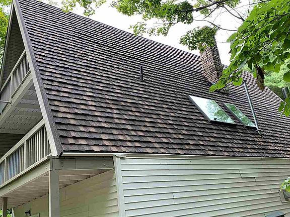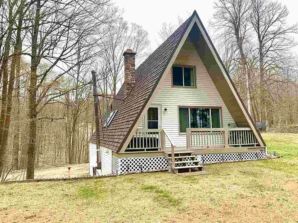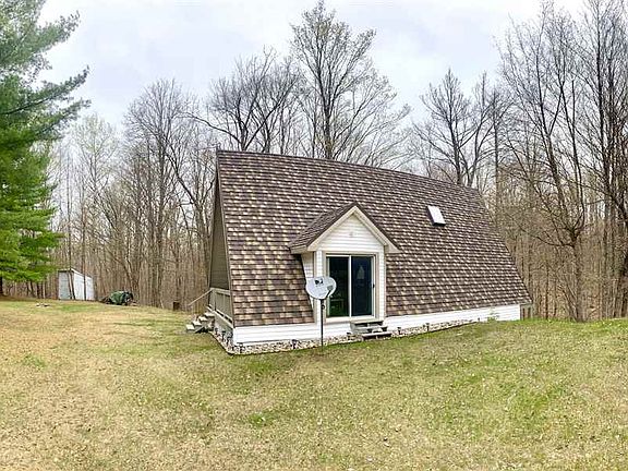 Beautifully nestled in the woods sits this three bedroom A-frame home which gives a feeling of seclusion and privacy as well as northern woods tranquility. The land sits adjacent to 2000 acres of State woods and you can sit on the deck and listen to the babbling brook near the parking area and hike through the mixed hardwood hills. This lovely home would make a great second home or up north getaway. Incredible improvements made in the last year include new chimney, new water heater, new skylights, and new stone coated roof by Green Horizons Metal Roofing with a 50 year transferable warranty to the proud new homeowners. A complete must-see home!