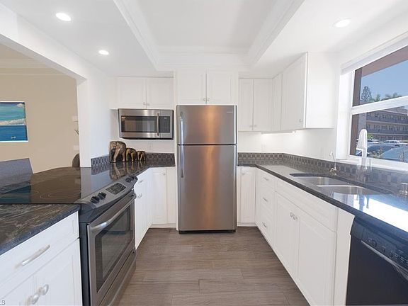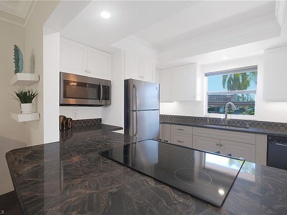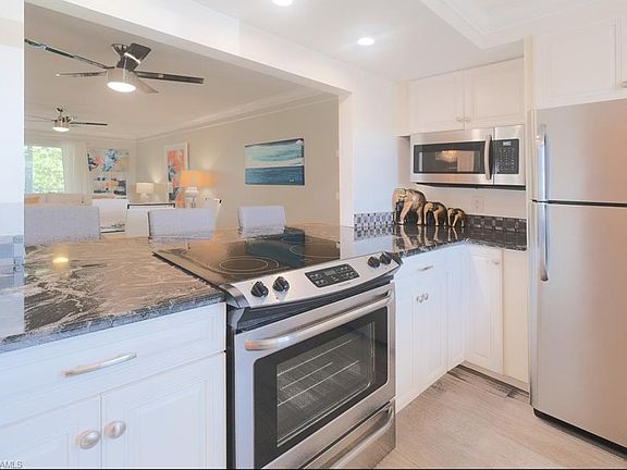 HUGE price reduction for a limited time only! Updated and offered turneky FURNISHED! Ready for you to move in for the season! A Coastal Chic Condo presented for Sale with brand new AC! Enter and bring your clothes! One person must qualify 55+ and LOW fee structure makes this a good buy! The Kitchen is striking, with Stainless Steel appliances with oversize offsetting Black Granite countertops. LED lighting and backlit crown molding adorn the home. New Stainless fans in every room including the Lanai, with recently installed Luxury Vinyl flooring Everywhere! Furnishings are very comfortable and lightly used! Bathrooms updated with walk-in shower in Master bath and bathtub in Guest. Closets offer plenty of space and washer and dryer are clean and shiney! Community Pool and Grillin' is close, and peaceful with lots of Greenspace and nice vistas! Great Locale, close to Food shopping, 5th Avenue, Sudgen Regional Park, Marco Island, Multiple Public Golf courses and conveniently situated to North Naples and all that it has to offer! Access to I-75 is close as well. Easy to show!