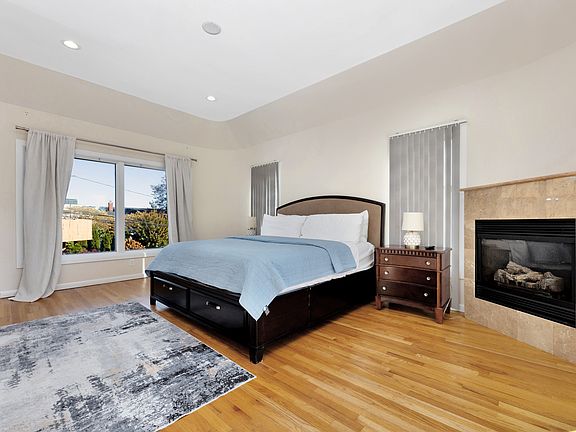 five bedroom tile and hardwood floors 10 ft ceiling and solid doors open concept living room leading into gourmet kitchen separate dining room 2 bedrooms on main level with bath heated floors large windows with sliders overlooking pool and grounds upper level master suite with walk in closets jacuzzi bath 3 terraces and vaulted ceilings office area with 2 more bedrooms and bath top level family room with roof deck