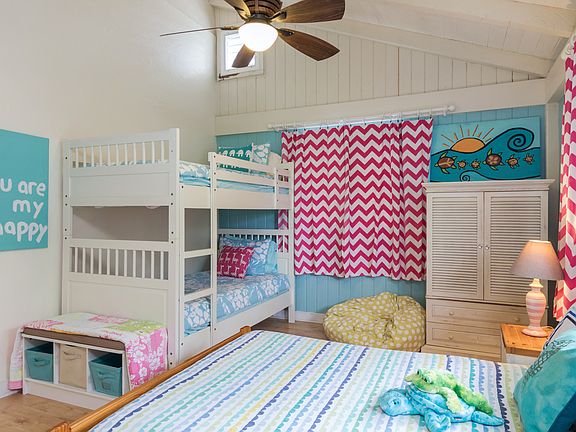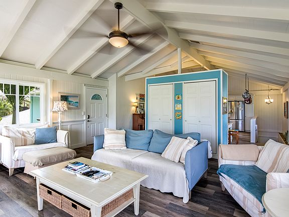 This beautifully maintained 2-bedroom, 2-bath home on Laie Point offers mountain, ocean, and garden views from a spacious open deck perfect for dining or relaxing. With 1,400 sq ft of living space, it includes a large kitchen, dining area, generous living room, and a primary bedroom with queen bed and ensuite. The second bedroom features a queen bed, twin bed, small couch, and desk comfortably sleeping up to 5 people.