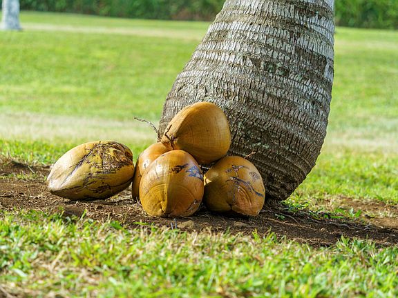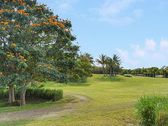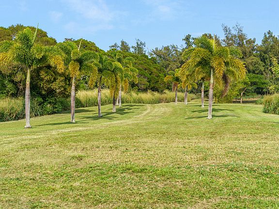 The terrain has been thoughtfully sculpted to create a tranquil pathway leading to a secluded future homesite at the property's rear. Here, enjoy captivating views extending over the broad pastoral landscape, with the iconic silhouette of Maui resting on the horizon. Nature flourishes throughout the acreage with established malabar chestnut trees, Samoan coconut palms, ulu, honey tangerine and lime trees, stands of bamboo, and a diverse collection of other palms and colorful tropical blooms.