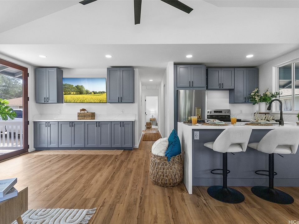 Newly renovated, you will find a bright, open concept living space with cooling trade winds and abundant natural light from large windows located throughout the home.  Recess lighting, split AC, a modern kitchen that flows seamlessly into the living area, are just a few of this quaint property's highlights. The primary bedroom with private bath, along with two additional bedrooms and a second full bathroom, provides extra space for family or guests.