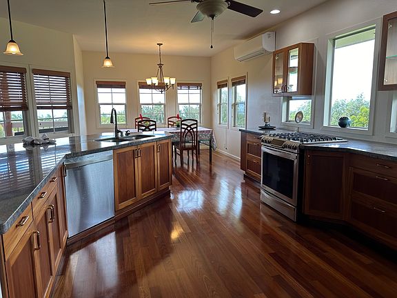 This unique property is located in Kapiko Estates at the end of a private cul de sac in Hawi on 3.14 acres. It views the ocean and Maui from the living room, dining room, ownerʻs bedroom suite, upstairs bedroom, lanai and two bedroom guest suite addition. Beautifully crafted and meticulously maintained, it features New Zealand Rimu bespoke cabinets, Brazilian cherrywood flooring, custom mahogany mango front door, ohia post supports in main first floor; soaring beamed cathedral ceilings and built ins in upstairs bedrooms, wood burning fireplace encased by built in cabinetry in living room. There are three bedrooms in the main home and two bedrooms in the guest addition. There are split AC units in the main house and window AC plus ceiling fans in the guest house. The property has 3,591 square feet of permitted living space with the guest suite completed in 2019. The two bedroom guest suite is separated from the main home by paved pathway lined with mature hydrangea hedges. There is an 11 panel net metering system which has been expanded in the last couple of years by an additional 15 panel solar system and a Generac back up battery system. The solar ensures lower electric bills and continuing power when there are electric grid outages. The orchard has seven lychees trees producing hundreds of pounds of fruit annually; several citrus, three types of banana trees and avocado trees. There is also a substantial greenhouse; garden potting shed; barn with artist studio; a fenced raised bed vegetable garden ready to be planted. Lilikoi, lemon grass and winged beans are still flourishing in the garden. The property is a flag lot at the back end of the development making the property is a quiet retreat. The Kohala ditch borders the rear of the property. This small custom home neighborhood has easy access to downtown Hawi with restaurants, shops, nearby ocean parks and is a short drive to Kohala Mountain Road making this an ideal location in bucolic North Kohala.