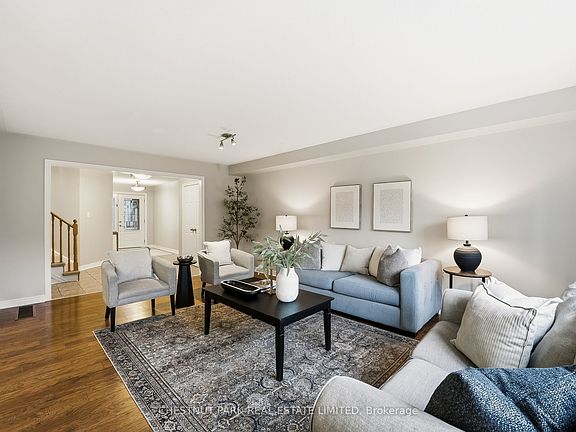 Bright 3-Bed, 3-Bath Freehold Townhome with Nearly 2,000 Sq. Ft. + Finished Basement - Offering nearly 2,000 square feet of living space above grade-plus a finished basement-this thoughtfully designed home stands out with its impressive second-level family room. This 250 sq. ft. bonus space expands the home's footprint and provides incredible versatility as a media room, playroom, office, or additional lounge area. The main floor features an open-concept layout with a generous living room and an updated kitchen equipped with stainless steel appliances, a centre island with breakfast bar, and a walkout to the fully fenced backyard. The south-facing patio with a direct BBQ gas line makes outdoor dining effortless. Upstairs, the primary bedroom offers his-and-hers double closets, while second-floor laundry adds everyday convenience. Laminate flooring runs throughout the home, and interior access to the double-car garage enhances functionality. Additional upgrades include a new AC (2022) and a replaced walkway (2020). With its finished basement, ample storage, and walking-distance proximity to Maple Bridge Trail, this property combines comfort, value, and modern living in a desirable community.