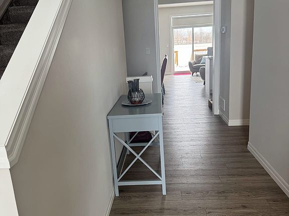 Modern 3-bedroom freehold townhouse (no condo fees) by Hayhoe Homes in Northcrest Estates. Features an open-concept main floor with designer kitchen (quartz countertops, island, pantry), dining area, and large great room with patio doors to rear deck. Main floor also includes a spacious foyer and 2-pc bath. Upstairs offers a primary bedroom with walk-in closet and 3-pc ensuite, two additional bedrooms, 4-pc bath, and second-floor laundry. 9 ft ceilings, vinyl plank flooring, A/C, HRV, and numerous upgrades throughout. Close to shopping, restaurants, parks, and trails