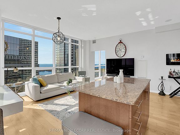 Prestigious And Highly Sought-After Maple Leaf Square Residence. Stunning High-Ceiling 44th-Floor Condo With Floor-To-Ceiling Wrap-Around Windows, Flooding The Space With Natural Light. Featuring Upgraded Appliances, A Kitchen Island, Extended Cabinets, Upgraded Light Fixtures, And Hardwood Flooring. Enjoy The Master Ensuite And A Smart Split Two-Bedroom Layout. Relax On The Large Balcony With Amazing Sw Views. Includes Owned Parking, Locker, And Heat. A Perfect Blend Of Luxury And Convenience! The Seller Agrees, At Their Own Expense, To Replace The Flooring In The Property Prior To Closing. The Flooring Material And Installation Will Be Completed To A Professional Standard And Shall Be Finished Before The Date Of Possession.