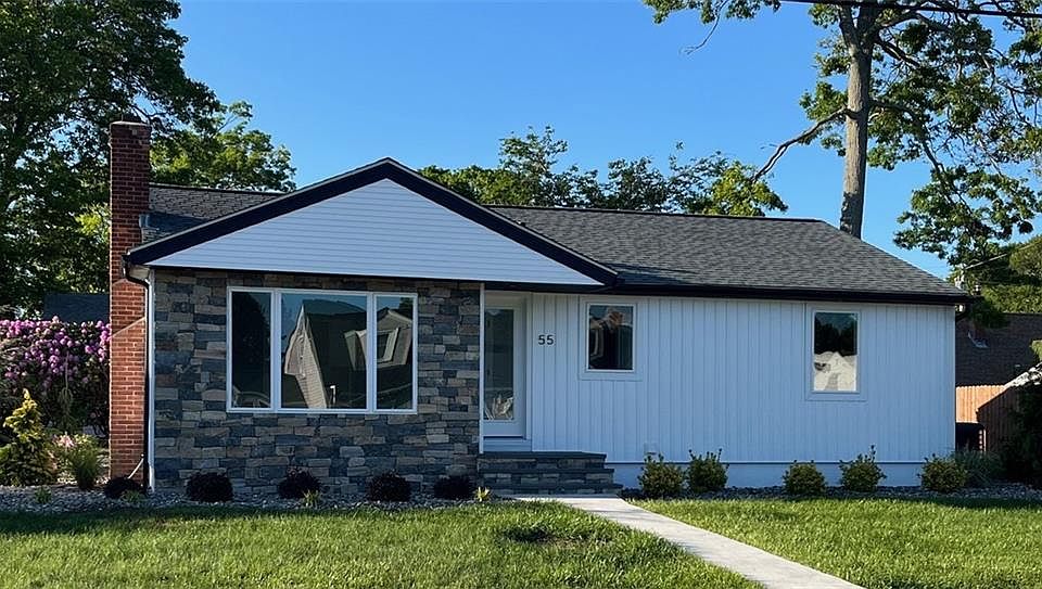 This tastefully updated ranch offers comfortable, modern living with thoughtful upgrades throughout. The home features a fully renovated kitchen and bathrooms, complemented by stylish finishes and efficient design. Enjoy peace of mind with all new windows, siding, gutters, driveway, walkway, and blown-in insulation. The roof is just 7 years old, and the gas furnace has been fully serviced. Additional highlights include central vacuum, whole-house security system, and a fireplace with a convenient gas connection. The exterior boasts exceptional curb appeal with a real stone front, elegant new bluestone stairs, a cobblestone-lined driveway, and river rock landscape beds. Bright sunroom featuring a fireplace and sliding glass doors that open to a fully fenced yard with a stunning new stone patio—perfect for relaxing or entertaining Move-in ready and designed for easy living — this home is a must-see!