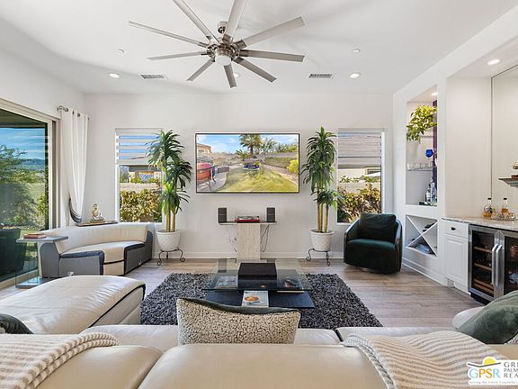 Resort-style living begins the moment you arrive at this beautifully upgraded "Preserve Model" in Del Webb Rancho Mirage - one of the desert's most desirable 55+ communities known for its vibrant social scene, clubhouse, fitness center, pools, pickleball, tennis, and more. Positioned to capture premier south-facing mountain views, this 2-bedroom PLUS den (or third bedroom) AND separate bonus room, 2-bath residence offers tall ceilings, an open floor plan, and effortless indoor/outdoor living. Designed for those who love to entertain, the gourmet kitchen shines with upgraded finishes, stainless-steel appliances, and a large walk-in pantry. The large detached island and adjacent dining area flow into the light-filled great room with a custom one-of-a-kind bar. You'll appreciate the multi-panel sliders framing the mountains. Step outside to a generous covered patio with tile flooring, fire-pit, commercial misting system, heaters, and remote-controlled sunshades ideal for year-round enjoyment. The private, low-maintenance backyard features an above-ground hot tub, putting green, and room to add a private pool or spa, all set against mountain views. The south-facing Primary Ensuite offers its own mountain views, a large walk-in closet, and a private bath with dual sinks and a walk-in shower enhanced with a bench and clerestory windows. Bedroom Two with adjacent bath is located on the opposite side of the home for excellent separation of space. The separate office/den adds flexibility and can easily serve as a third bedroom. Additional highlights include an interior laundry room, attached two-car garage, and a bonus room off the garage perfect for a workshop, wellness area, or hobby studio. A rare blend of luxury, lifestyle, and location ready to welcome its next owner.