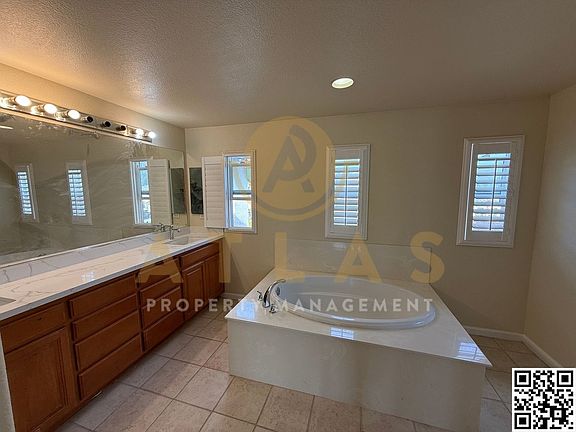 Four well-sized bedrooms, including a large primary suite with plantation shutters, hardwood floors, and spa-like bathroom featuring a soaking tub, dual sinks, and plenty of counter space.