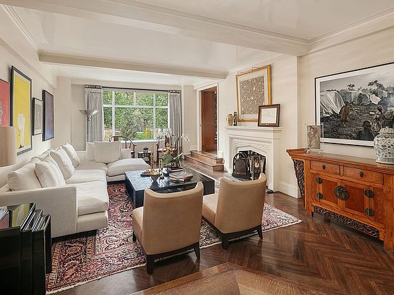 Upon entry into the grand foyer, you are guided into the expansive, sunken living area. Flooded with natural light and adorned with a decorative fireplace, this resplendent home is accompanied by 10 foot ceilings, original pre-war details, hardwood floors and picturesque panoramas throughout.
