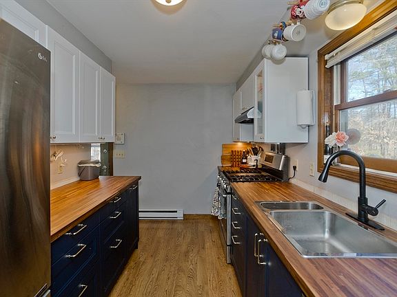 Nestled on peaceful country roads, this charming ranch offers a rural setting just minutes from downtown and shopping. The recently renovated galley kitchen boasts butcher block counters and under-cabinet lighting, perfect for meal prep. Enjoy your culinary creations in the enclosed porch, a retreat for dining and relaxation. Three spacious bedrooms provide comfort, each with ample closet space. The walkout basement presents endless opportunities for expansion, whether for additional living areas or storage. Owned solar panels contribute to energy efficiency, reducing utility costs.