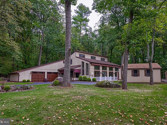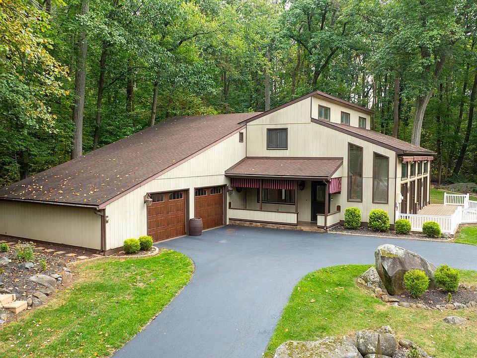 MULTIPLE OFFERS received - Offer Deadline is WED 10/8 - 12 pm Look no further—this stunning almost 3000 square foot Contemporary-style home offers the perfect blend of privacy, elegance, and natural beauty. Nestled on a thoughtfully landscaped 1.05-acre partially wooded lot sitting at the end of a cul-de-sac, this home is a private retreat surrounded by nature. One of the homes standout features is breathtaking atrium, showcasing four sets of wall-to-wall French doors, topped with large triple paned windows, a cathedral ceiling, and south-facing windows that bathe the space in natural light. The French doors open directly onto a spacious composite deck, perfect for outdoor entertaining. The 3 Retractable awnings could provide the right amount of shade for sunny afternoons. Gather at the custom paved sitting area and fire pit that has a built-in French drain for low maintenance care. This is the perfect spot for a night under the stars while you watch the deer pass through. Just off the Atrium is a cozy living room—ideal as a sitting area, reading nook, or even a bright and inspiring home office space. The updated kitchen offers beautiful white cabinetry, generous granite countertops, subway tile backsplash, under & over cabinet lighting, a recessed TV panel, and large breakfast bar that opens seamlessly to the dining area. The elegant dining room boasts a statement light fixture. For today’s remote work/study needs, this home includes a dedicated office workspace, with two built-in desks, expansive counters, custom cabinetry, wood flooring, and recessed lighting above & below. Built-in wire cutouts make it easy to keep your electronics and cables organized. Step into the inviting family room, where a large bay window frames views of the private, tree-lined backyard. Thoughtful details such as chair railing, wainscoting, dual ceiling fans, and a built-in surround sound system create both fun and comfort. This is where you will find the granite-topped wet bar with custom oak cabinetry, pendant lighting, wood flooring & subtle backlighting making this the perfect spot on game day or movie night, it’s the perfect entertaining room. The bar comes fully equipped with a refrigerator, bar stools, and TV, all included. This space is heated and cooled by a split unit. From here, you’ll find access to the oversized 22ft two-car garage with updated garage doors, designed with enough room to accommodate a full-size truck or SUV and a hobby/work area. This home offers even more to love with a fully remodeled first-floor full bath with a stylish tiled walk-in shower with a frameless glass door, and decorative tile wall & custom cabinetry. The spacious 1st floor laundry & utility room adds convenience on laundry day. Ascend to the 2nd floor interior balcony, where three of the four bedrooms await. Each bedroom showcases vaulted/cathedral-style ceilings & large windows that provide the spaces with natural light. Upstairs, the second full bath impresses with a custom vanity & cabinetry, elegant tile flooring & a tiled shower with a sleek glass door—bringing both style and function to the home. The primary suite offers private access to a deck overlooking the tree-lined backyard—an ideal spot to sip coffee while enjoying the view of passing wildlife. Bedroom #3 features a W/I closet, while the 4th bedroom has its own private staircase & additional finished room/storage area, perfect for an guest room or a quiet home office. An expansive unfinished storage area sits above the family room and garage, complete with a hatch for direct garage access—offering excellent convenience. Enjoy year-round comfort with a high-efficiency Lennox heat pump. The property is connected to public water, plus it includes the convenience of a private well—perfect for washing cars or watering your garden. The new large shed make it easy to store all of your yard equipment. Visit this stunning home to enjoy the impeccable attention to detail.
