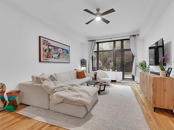 University Place and Broadway. The residence features a generously-sized open floorplan with a large dining room off the foyer and kitchen. In the rear is a fabulous living room with a wall of glass that leads to the incredible patio where you can entertain, sunbathe, and dine a la carte. It’s your own peaceful paradise and a rare find in NYC! Also gracing the elegant expansive interior are rich hardwood floors, steel casement windows, abundant closets including walk-ins and a pantry, and central heat/air conditioning. The roomy kitchen and updated bath are both finely designed in chic black and white. Set in the rear overlooking the garden is the spacious bedroom with its own big double closet. The Jefferson allows unlimted rentals after Owner lives in the unit for 1 year.
