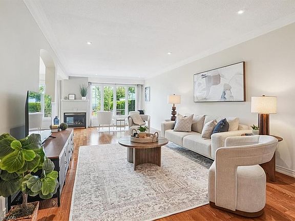 Experience unparalleled lakefront living with this exceptional property, offering breathtaking vistas from nearly every room. Perfectly positioned within the prestigious Newport Yacht Club community, this home provides the rare convenience of mooring a boat just steps from your front door, along with effortless QEW access for commuting. This “linked” townhome lives like a detached home, sharing no common walls and boasting parking for six vehicles, including a full double garage. The open-concept main level is a showcase of style and comfort, featuring an updated kitchen with new quartz counters, crown molding, gleaming hardwood floors, a gas fireplace, and a separate dining room. Step through sliding doors to an oversized patio that stretches across a meticulously landscaped 100-foot yard, leading to a private waterfront patio where you can watch the sun rise or set over Lake Ontario. Upstairs, you’ll find three generous bedrooms plus a home office, bedroom-level laundry, 2nd gas fireplace in primary suite and two fully updated bathrooms. The primary suite opens onto a balcony where the panoramic lake and Toronto skyline views are simply unforgettable. Notable updates include new counters, sinks, faucets, roof, furnace, AC, light fixtures, and window treatments. A finished lower level with a walk-up to the yard adds even more living space. Rarely available, this is a truly special opportunity to secure a piece of Lake Ontario’s waterfront—an address where every day feels like a getaway.