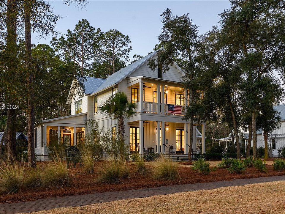 This expertly sited, five-bedroom, five full and one half bath Moreland Forest charmer takes full advantage of its half-acre site. Overlooking a wooded preserve and parkland greenspace, the property is lined with live oaks, pines, & palmettos & has plenty of space to move around. The 2,943-square foot main house includes four ensuite bedrooms, one of which is a four-bed bunk room with its own full bath. Its 520-square foot guest cottage sleeps four & has a screened porch, kitchenette, & a two-bed sleeping loft above the main room. This home has easy access to Moreland Village amenities, River Road Preserve, & Crossroads 9-hole golf course.