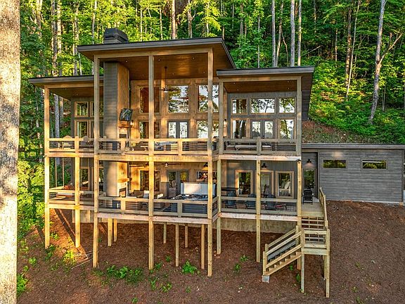 Experience the kind of mountain home everyone asks for but rarely finds—long-range layered mountain views from every level, a coveted Aska Adventure Area address, and less than 10 minutes on all paved roads to downtown Blue Ridge. This beautifully maintained luxury lodge is offered fully furnished, so you can start enjoying it—or renting it out—on day one. From the moment you step inside, the soaring great room draws you in with a dramatic stone fireplace, wall of windows, and an easy flow into the chef's kitchen. Granite countertops, a large custom island, and a walk-in pantry make cooking and entertaining feel effortless, whether you're hosting a full house or sneaking away for a quiet weekend. Four ensuite bedrooms, each designed to capture the view, give everyone their own private retreat. Warm wood flooring, timber accents, and stone fireplaces on multiple levels deliver that true “mountain lodge” feel, perfectly balanced with modern finishes and thoughtful storage. The terrace level is set up for fun—wet bar, game area, additional suites, and direct access to covered decks with those same sweeping views. Outside, expansive porches and decks invite you to dine al fresco, unwind by the fire, or simply listen to the soothing sounds of the nearby stream. The attached garage is a rare bonus in this area, ideal for parking, storing toys and gear, or creating an owner's closet. Blue Ridge is one of the strongest short-term rental markets in the North Georgia mountains, thanks to Lake Blue Ridge, the Toccoa River, Aska hiking and biking trails, the Scenic Railway, boutique shops, and a vibrant dining and music scene that draws guests year-round. In a great area with incredible rental potential and a home that still feels fresh, cared-for, and ready to go, this is the Blue Ridge mountain house buyers dream about—your personal getaway, your next investment, or both.