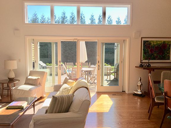 Centrally-located, south of highway charmer with easy layout and great vibe. Sun drenched, post modern with vaulted ceilings, oversized windows and exposed beams running throughout house. Expansive great room and open floor plan fantastic for entertaining, flowing easily out to decks, slate patio and heated pool. Spacious outdoor shower with its own changing area. CAC. 3 ensuite bedrooms, a half bath just renovated with high end fixtures (and PB w radiant heat floor). Newly renovated kitchen with brand new chef grade appliances and every cooking accessory you will need. All rooms have soaring cathedral ceilings & floor to ceiling windows / glass doors facing beautifully sculpted backyard with established landscaping. Southern exposure means all day sun and breathtaking sunsets. Immaculately kept and beautifully appointed with a mix of designers, Danish Modern and curated pieces, and comfy Mitchell Gold living room furniture. High end linens. 55" smart TV. Truly the perfect summer retreat, or getaway for all seasons. Five min. to village, shops, restaurants, gourmet grocery, train, Jitney. Just 10 min ride to East Hampton, Southampton or Sag Harbor. Ocean beaches less than 2 miles away - a fabulous jogging route studded with beautiful scenery, horse farms and fields. 400 foot driveway puts you off the road for complete privacy and peace & quiet.