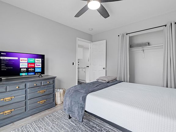- Exterior features: 50" HDTV, Backyard, Baking sheet, Bed linens, Cleaning products, Clothing storage: dresser, Coffee maker, Cooking basics Pots and pans, oil, salt and pepper, Dedicated workspace, Dining table, Dishes and silverware Bowls, chopsticks, plates, cups, etc., Essentials Towels, bed sheets, soap, and toilet paper, Extra pillows and blankets, Fire extinguisher, First aid kit, Free driveway parking on premises 2 spaces, Hangers, Hot water included in rent, Iron, Kitchen, Long term stays allowed, Outlet covers, Pets allowed, Room-darkening shades, Security cameras on property, Self check-in, Single level home, Smart lock, Toaster, Wifi, Wine glasses