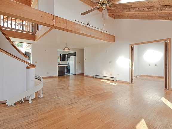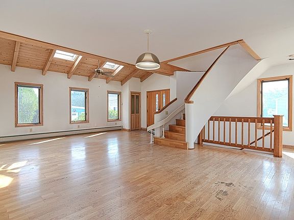 Welcome to 55 Howard St.- Not your everyday home! Want something different this is the house. One owner, customer built. Needs some updates. Bright open first floor with oversized living room, all glass dining area that open up to a composite deck. 80's modern kitchen that could uses some updates. First floor also has an office, study & full bath. Upstairs is all main bedroom area with balcony deck, main bath and large walk in closet. Floors upstairs are plywood and both baths need updating. Full basement. Yard has a shed and had a garden. Home has central air.