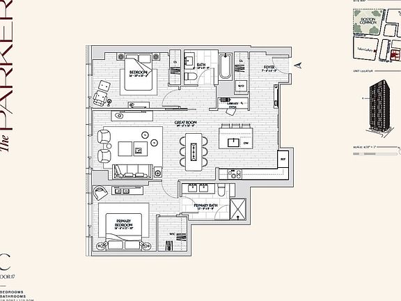 3% TO BUYER'S AGENTS! Be the first to call this thoughtfully designed 2 bed 2 bath home. One of Boston’s premier new luxury residences, The Parker is perfectly positioned in the Theater District, just moments from Boston Common, the Public Garden, MBTA lines, Downtown, Back Bay, and more. Inside residence 1703, floor-to-ceiling windows fill the space with natural light, city views charm every room, and wide-plank white oak floors add warmth and sophistication. The kitchen features a custom Italian marble backsplash, brass accents, and a mix of materials and textures, creating a sleek, modern aesthetic. Residents enjoy the convenience and security of a 24-hour concierge, a state-of-the-art fitness center by Gronk Fitness, and a spectacular rooftop deck showcasing panoramic city views. Curated by Zarifi Design, the building’s speakeasy-inspired amenities include a stylish cocktail lounge, private screening room, and refined indoor-outdoor entertaining spaces.