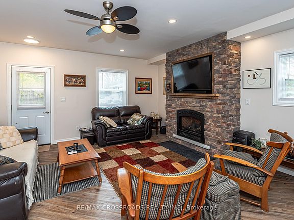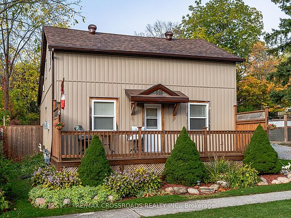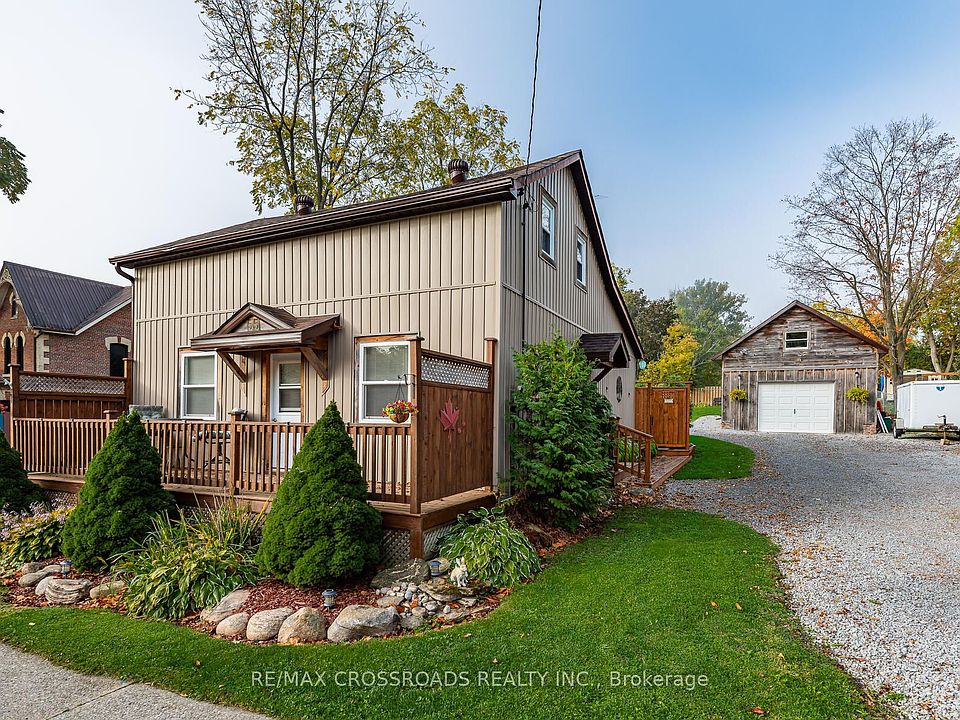 Welcome to this charming 1 1/2 story century home in the centre of the gorgeous little town of Cannington. Nothing to do just move in and enjoy your morning coffee on your large front porch. Afternoons in your beautiful fenced backyard, or working in your large detached garage with loft. Enjoy evenings cooking in your lovely spacious updated eat-in kitchen, then relaxing by the cozy gas fireplace with a built-in TV. Primary Bedroom on main floor could also be used for office or family room. Great for first time home owner! Nothing to do plus all appliances included even 2 TV's. Wonderful location close to all amenities.