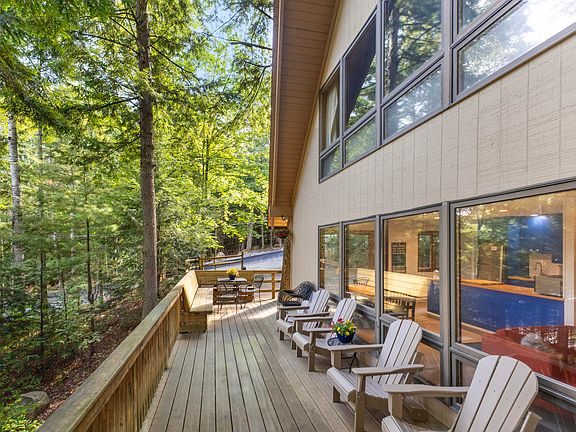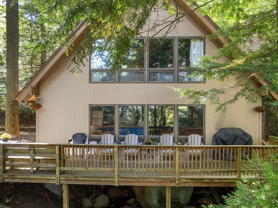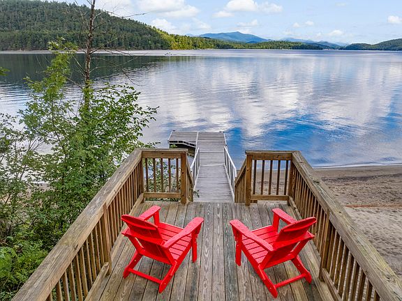Discover your Adirondack retreat at Blue Sky Estates on Schroon Lake! This classic lakefront chalet combines the best of both worlds—exclusive HOA amenities AND the privacy of your own shoreline. Enjoy the community's sandy beach and shared dock, while also claiming 103 feet of your own private beachfront with a personal dock and streamside sitting area. Inside, the open floor plan creates a warm gathering space, with three bedrooms and two full baths offering comfort for family and guests. Spend mornings sipping coffee on the deck, afternoons paddling from your dock, and evenings fireside, taking in the glorious sunsets behind the High Peaks. Just minutes to Gore Mountain for world-class skiing, connected to extensive snowmobile trails, and surrounded by vibrant fall foliage, this property offers four seasons of adventure. Whether you're boating, hiking, skiing, or simply soaking in the views, every day here feels like a true Adirondack escape.