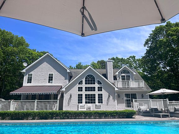 Rental Registration #: EH 24-901 Modern home in pristine condition with 4 bedrooms and 4 bathrooms, spread across 3 levels. Conveniently located in Northwest Woods between East Hampton and Sag Harbor in a private beach community with a very short stroll to the community beach. The house is light and airy with open floor plan. Appointed with new furniture, 4 flat screen smart TVs, and Nest thermostats on every level. The first floor features double height living room, an open kitchen with premium appliances and an open dining room with sliding doors that lead to an outdoor dinging area with an automated retractable awning. The first floor also includes 2 bedrooms and a full bath. The first bedroom has a queen bed and the second bedroom has a premium pull out sofa. The second floor features master bedroom with a king bed and an en-suite bathroom with a jacuzzi tub, and another bedroom with two twin beds, en-suite bathroom and a walk in closet. On the other side of the second floor, you will find a large 1 1/2 height loft with a giant couch, large work space with multiple screens and cushy office chair. The loft also features a balcony overlooking the pool and the backyard. Finished walkout basement features a family room, wet bar, play space, gym and a full bathroom. The private outdoor oasis features multi level newly painted cedar decking, oversized L shaped 40 ft long pool with extended shallow section. Loungers, multiple soft seating areas with 5 umbrellas for extra shading and comfort. Adjacent to the pool, surrounded by privet hedges is an outdoor seating area complete with Adirondack chairs, fire pit and outdoor fire place. The property is fully fenced, with two automated gates on each side of a circular driveway and has beautiful landscaping, with lush grass lawns and evergreen trees along the perimeter of the property for extra privacy. Fully stocked with a Weber gas grill, charcoal grill, new beach chairs, beach towels, kitchenware and appliances. Laundry room on the first floor for extra convenience. If you are traveling with children, the play area in the basement can occupy kids across age ranges, with lots of toys, books, board games, sports equipment, scooters, etc. This family home is located in a quiet neighborhood that is perfect for a restful Hamptons get away.