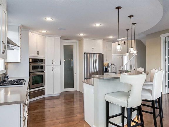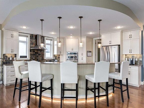 Welcome to lakeside luxury in Monterra, where mountain views, peaceful green space, and modern design come together on a stunning 1/3 acre south-facing lot. This estate home offers over 4,100 sq. ft. of thoughtfully designed living space that captures breathtaking views from nearly every room. From the moment you walk in, you’ll notice how light and scenery flood the open-concept main floor. The heart of the home is the chef’s kitchen—complete with a striking curved quartz island, Bosch and Jennair appliances, and endless white cabinetry (with a built-in toe-kick vacuum for easy cleanup). The walk-through pantry connects seamlessly to a family-sized mudroom with custom lockers, making everyday living effortlessly organized. Just off the kitchen, the great room showcases panoramic lake and mountain views with a cozy fireplace for those crisp Alberta evenings. Need to work from home? A private main floor office offers quiet focus away from the buzz of daily life. Upstairs, the showstopper is the vaulted primary retreat—complete with heated floors in the spa-like ensuite and tinted windows for both comfort and privacy. Step out onto your private balcony, coffee in hand, to soak up unobstructed mountain and lake views before the rest of the house wakes. Two additional upper bedrooms and a well-placed full bathroom sit just down the hall, along with a spacious laundry room for added convenience. Downstairs, the fully finished walkout basement provides ultimate flexibility. Whether it’s multigenerational living, if you want to add a separate private living quarters, room for guests, or another family hangout spot—the layout is ready, featuring two more bedrooms, a wet bar/kitchenette, second laundry, and a separate entry. Add a door and a cooktop, and you’re nearly there. (A secondary suite would be subject to approval and permitting by the municipality.) The home runs efficiently with in-floor heating, two furnaces, water softener, and solar-ready wiring. The triple garage- It’s finished with epoxy flake floors, baseboard heat, and room for all your gear. Step outside to your beautifully landscaped yard with irrigation, a custom stone and wrought iron fireplace/Pizza Oven, roman paved patio, and wiring for a hot tub—your outdoor entertaining dreams await. Monterra at Cochrane Lakes is where luxury meets nature—a semi-rural setting just minutes from the city and the mountains. Book your showing today and discover why this is more than a home… it’s a lifestyle.