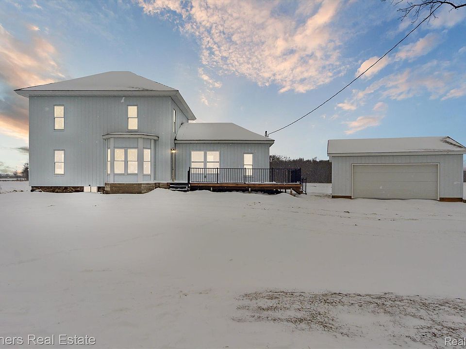 Stunning 4-Bedroom, 2.5-Bathroom Home with Modern Updates and Breathtaking Views! Welcome to this beautifully updated two-story home nestled on an acre of tranquil land, surrounded by serene fields. Step into the heart of the home - the large, newly renovated kitchen featuring a generous peninsula with bar seating, sleek brand-new stainless steel appliances, and an abundance of cabinet storage and counter top space. A pantry provides even more storage, while the new lighting, cabinets, and pulls add a modern touch. Through the glass slider, step out onto the back deck/wraparound porch and take in the stunning views of peaceful, open fields. The kitchen opens directly to the dining and massive living areas, both boasting soaring ceilings, a bay window, and an influx of natural light. Just off the living room you'll find a main floor bedroom with a large closet. A gorgeous half bath with a white oak vanity, and a well-sized laundry room, round out the first floor. Upstairs, you'll find three additional bedrooms and two full baths. The primary suite is a true retreat, featuring a luxurious ensuite with a large shower, stunning dual-sink vanity, and a huge walk-in closet with a daylight window for perfect lighting. The other full bath on this floor is equally impressive, with a new dual-sink white oak vanity, plenty of storage space and a tub/shower combo. All bedrooms have new carpet and ceiling fans. Outside, enjoy the convenience of a two-car detached garage, with a side door that leads directly to the home's side entrance. The peaceful, spacious acre of land offers plenty of room to roam and relax, providing a perfect setting for your next chapter. Updates include roof, steel siding, bathroom vanities, kitchen cabinets, counter tops, appliances, light fixtures, flooring and paint throughout. Immediate occupancy.
