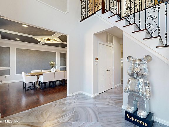 Step through the grand double doors into a home adorned with beautiful crown moldings, vaulted ceilings, and luxury hardwood floors throughout. The spacious living room is highlighted by an electric fireplace, creating an inviting ambiance for both relaxing and entertaining. This residence boasts six generously sized bedrooms, including a primary suite with a spa-like en-suite bathroom, and three additional exquisitely renovated bathrooms, all designed for comfort and elegance.