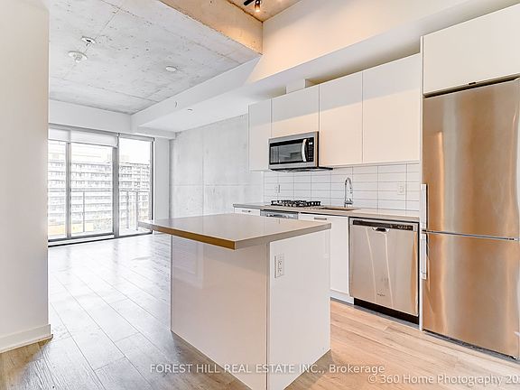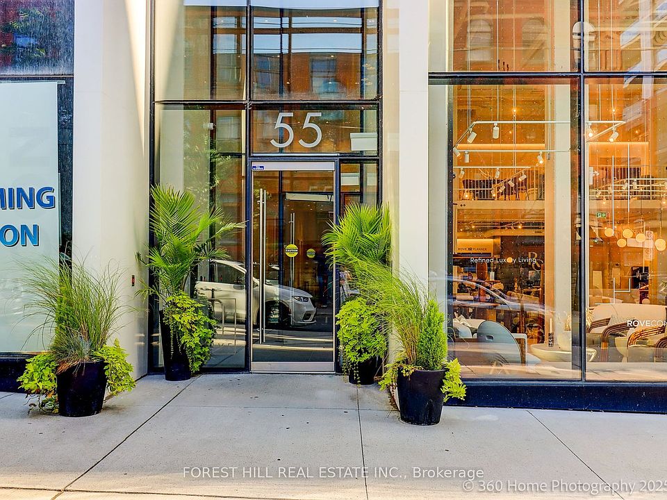 Welcome to EAST 55, Toronto's chic condo located on quiet, leafy Ontario Street. This 1 BR plus Den, HIROSHIMA MODEL is the ideal home for anyone looking for a stylish urban retreat. Bright open concept LR has wall-to-wall glass windows with a walk-out to a huge balcony with an unobstructed view. The soaring 10.5 ft exposed concrete ceiling provides a spacious feel. Freshly painted in a modern color palette. Extended Kitchen cabinets (30"), Drawer under the oven, under-cabinet lighting and a smart quartz Island defines this modern kitchen. The Spa-like bathroom boasts elegant marble flooring and shower walls. Friendly concierges and secure access make this a desirable place to call home. Location is perfect, with proximity to the Distillery district, St.Lawrence market, King street Street cars, George Brown College, and steps to TTC. Excellent walking score. Hurry! This sophisticated condo won't last!!!