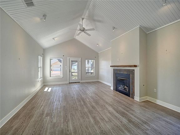 Central fireplaceFenced green areaOpen floor planVinyl plank flooringStainless steel appliancesLots of cabinetryFantastic kitchen