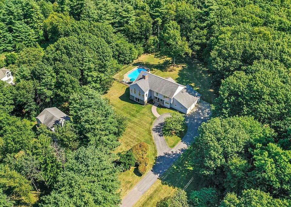 SERENE retreat just 30 miles from Boston with this ELEGANT 4-bedrm, 4.5-bath home, offering a BLEND of COUNTRY LIVING & MODERN LUXURY. 4.56 acres & adjacent to 60 acres of conservation land, ensuring both privacy & STUNNING NATURAL surroundings. Living room features a SOARING cathedral ceiling, hardwd flrs, and floor-to-ceiling windows that bathe the space in light. A formal dining rm adds charm with its fireplace, custom mantle, hardwd flrs, & access to the deck. The family rm boasts another cozy fireplace, direct access to a full bath & sauna, plus a slider opening to the yard. The CHEF’S KITCHEN is a CULINARY DREAM with 11.5-foot island, ample seating, & 4-zone layout. The primary suite includes a walk-in closet & LUXURIOUS full bath, a 2nd bedrm offers its own en-suite bath. 2 addit’l bedrms with generous closet space, & expansive office features custom built-ins. SUNROOM connects you to the TRANQUIL outdoors & IN-GROUND pool. 3-CAR garage, 2 story flexible barn & NEW SEPTIC