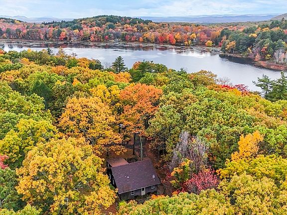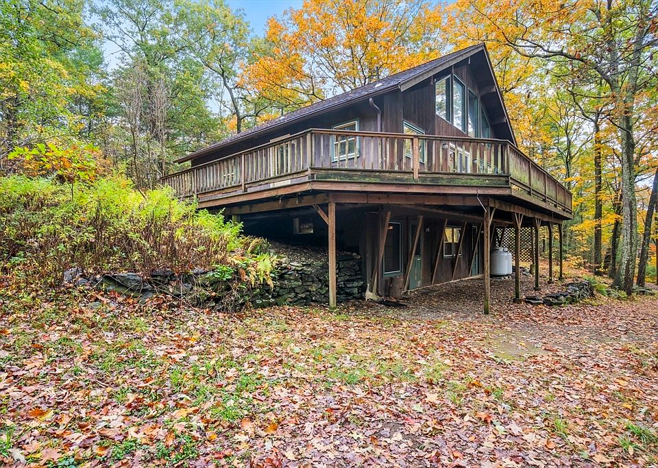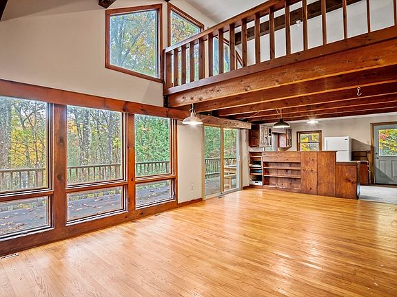 Welcome to your cabin in the woods! This contemporary home blends rustic charm with natural surroundings on a peaceful 1.4-acre lot overlooking a pond. The main level features a bright open layout with cathedral ceilings, exposed wood beams, and a wood-burning fireplace that anchors the living room. The adjoining dining area and kitchen offer deck access—perfect for outdoor dining or quiet mornings by the water. The first floor includes two bedrooms with wood flooring and a full bath with tub and shower. Upstairs offers a loft with warm wood finishes, an office with French doors, and a spacious main bedroom with closet storage. The walk-out lower level provides additional living space with a full bath, bedroom, and kitchenette—ideal for guests or in-law setup. Whether it's an investment property, a primary or second home, enjoy the wraparound deck, wooded setting, and direct pond access for year-round relaxation or recreation!