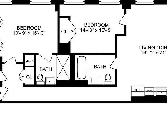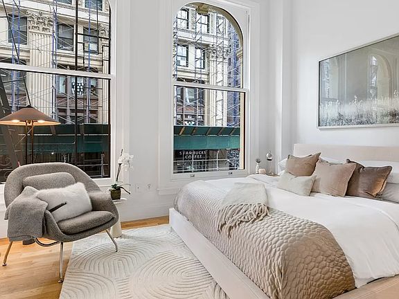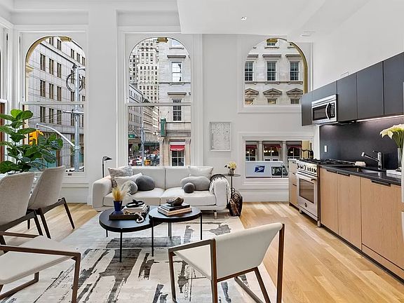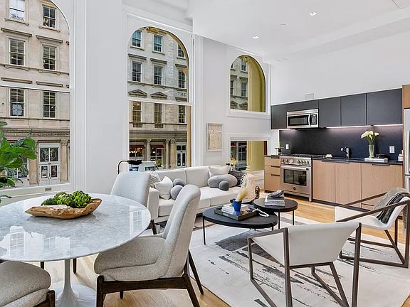 2-Bedroom / 2-Bathroom Loft This stunning apartment boasts a charming corner living and dining area adorned with 6 expansive arched windows (approximately 8 feet tall). The open kitchen is equipped with top-of-the-line Bertazzoni appliances including a gas range, dishwasher, microwave, and refrigerator, complemented by custom Scavolini cabinetry featuring honed black mist granite countertops. The bedrooms are strategically split for optimal privacy, both offering delightful views over Reade Street. The primary bedroom comfortably accommodates a king-sized bed and includes an ensuite bathroom, while the second bedroom comfortably fits a queen-sized bed, both with generous closet space. Bathrooms are elegantly finished with Nero Marquina and Statuario Bianco porcelain stoneware, Waterworks hardware, Robern medicine cabinets, and either a spacious glass-enclosed shower or a shower/tub combination. Additional features of the apartment include lighting by Artemide, central air and heat, hardwood floors, solar shades on all windows, and a Bosch washer/dryer.