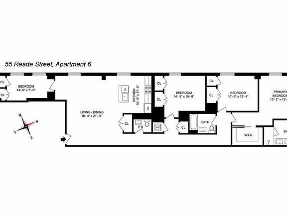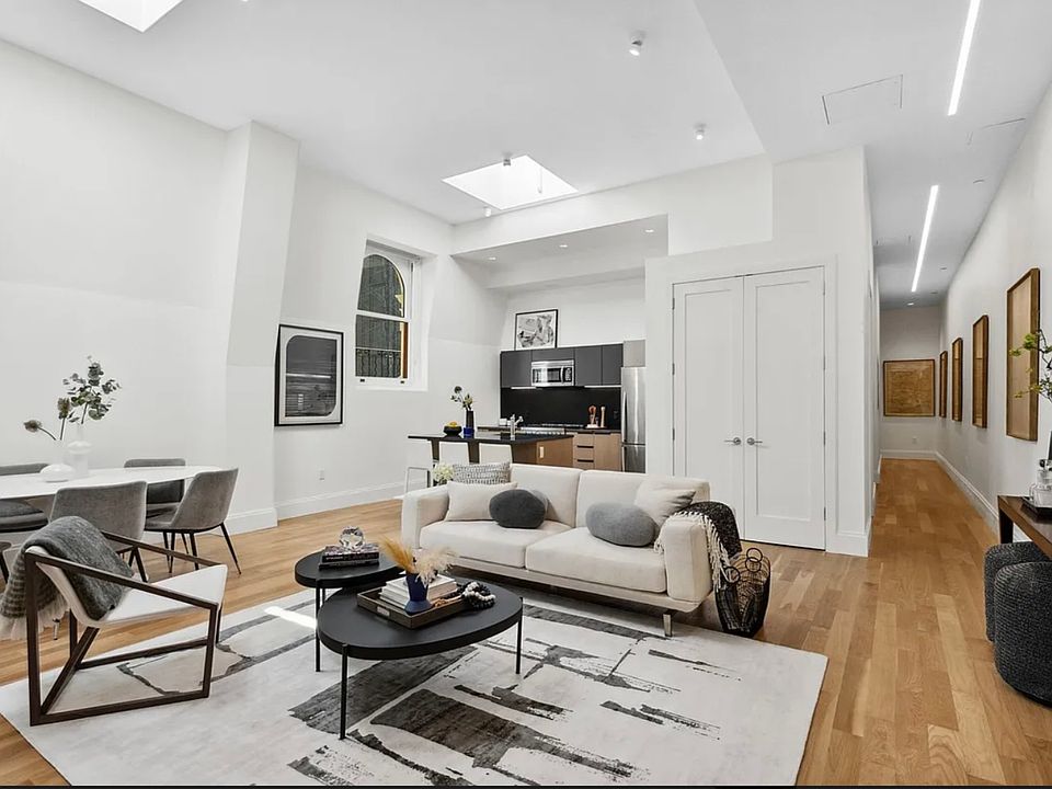 Apartment #6 is a spacious full-floor residence offering 3 bedrooms, a home office (potential 4th bedroom), and two and a half bathrooms, all with soaring ceilings up to 14 feet. The apartment boasts a large living and dining area with an open kitchen, illuminated by two skylights that flood the space with natural light. The kitchen is equipped with a central island, top-of-the-line Bertazzoni appliances (gas range, dishwasher, microwave, and refrigerator), and custom Scavolini cabinetry complemented by honed black mist granite countertops. The corner primary bedroom accommodates a king-size bed and features a windowed en-suite bathroom and a custom-designed walk-in closet. Two additional bedrooms can comfortably fit queen- or king-sized beds, while the fourth bedroom is ideal for a twin bed or as a home office. All bedrooms face Reade Street and offer ample closet space. The bathrooms are elegantly finished with Nero Marquina and Statuario Bianco porcelain tiles, Waterworks hardware, Robern medicine cabinets, and either large glass-enclosed showers or shower/tub combinations. Additional highlights include lighting by Artemide, central air and heat, hardwood floors, solar or blackout shades on every window, and a Bosch washer/dryer. 55 Reade Street is a historic Cast Iron building in the heart of Tribeca, dating back to 1872. Recently restored by United American Land, LLC, it received the prestigious Lucy G. Moses Preservation Award from the Landmarks Conservancy for its exceptional restoration. The building has been transformed into a boutique residential building, with just nine residences-never more than two per floor. Its stunning facade blends Italianate and French Second Empire architectural styles, featuring original cast-iron columns, grand arched windows, a mansard roof, and ceiling heights up to 14 feet. Residents will enjoy modern amenities such as virtual doorman technology. Situated in an ideal Tribeca location, 55 Reade Street provides access to world-class restaurants, shopping, schools, parks, playgrounds, and excellent public transportation options, including the 1, 2, 3, A, C, E, 4, 5, 6, and N, R, W subway lines.
