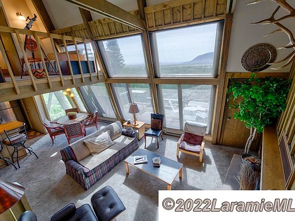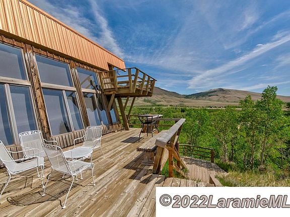 Uninterrupted vistas, blue Wyoming skies and sunshine! Painstakingly cared for and used lightly but lovingly, this copper-roofed mountain retreat on 4.9 grassy acres will surround you with coziness and warmth and leave you wide-eyed at the views...to the Laramie Plains, the Colorado Rockies and west to the Medicine Bow! You're at the end of the road, with hiking across adjacent BLM and fishing on the North Fork River below. And....you'll hear the river through the quiet! An open great room, dining and user-friendly kitchen area are easily accessible to the south-facing deck. Two bedrooms plus an expansive sleeping loft, offer space to host a "bunch" of friends! Two bathrooms, a stacked washer/dryer and garage with full-length work space provide everything you'll need to hunker down and let the world go away! And....if you're into winter or summer recreation, a handy "sports locker" by the main entrance gives you room to store your skis, boots, fishing poles and foul-weather gear.
