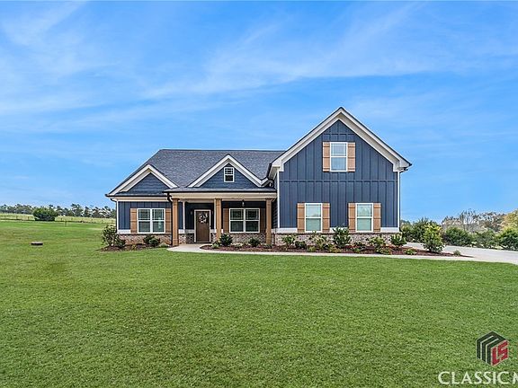 Stunning Like-New Craftsman Home Built in 2022! Nestled on over 2 acres in the coveted River Cove neighborhood, this home exudes charm and modern elegance. With 4 spacious bedrooms, 3.5 baths, and an open floor plan, it's designed for both comfort and style. Interior Highlights: Inviting LVP flooring flows through the living room, dining room, foyer, breakfast area, and kitchen. A bright kitchen with white cabinets, granite countertops, a tiled backsplash, and a pantry. Elegant crown molding throughout the main living areas. Private office with French doors for work-from-home flexibility. Sunroom filled with natural light, ideal for entertaining or a peaceful retreat. Oversized owner's suite with a trey ceiling and resort-inspired bath, featuring a soaking tub, frameless tiled shower, dual walk-in closets, and cabinet accents. Large secondary bedrooms with abundant closet space. Laundry room with decorative tile flooring and cabinetry, adding both style and function. Exterior Features: Covered front porch and back patio perfect for morning coffee or evening relaxation.Three-car garage with carriage-style decorative doors.Level lot with beautiful landscaping. Raised panel doors and brushed nickel fixtures throughout. Designer paint choices, 2-inch faux blinds, and architectural shingle roof for a timeless look. Conveniently located just minutes from I-20, Meta and Rivian, restaurants, and shopping! This move-in-ready home combines luxury and comfort, making it a must-see!