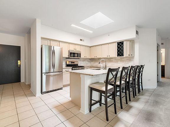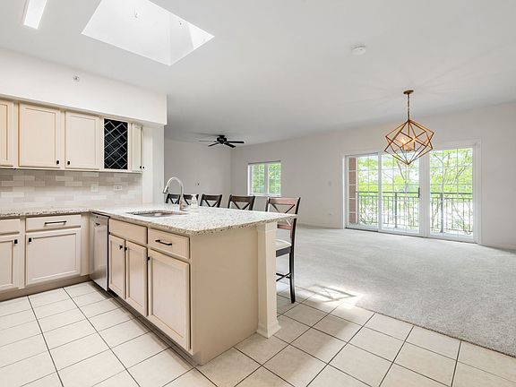 Discover refined living in this top-floor end-unit condo-within walking distance to downtown Palatine and the train station. Enjoy modern comfort paired with ultra-convenience. Gourmet Kitchen: Recently remodeled with light cabinetry, granite countertops, and stainless-steel appliances. A spacious breakfast bar and large skylight flood the space with natural light. New carpet in the Living room/ Dining room Luxury Bath (2019): Full remodel featuring quartz counters with touchless faucet, custom glass shower door, and elegant tile flooring. Spacious primary bedroom includes a walk-in closet-ample storage and privacy. Flexible Office/den: Perfect space for a home office or hobby room that adapts to your needs. Generous balcony offers scenic sunset views-perfect for morning coffee or evening relaxation. Convenient Laundry, In-unit high-efficiency washer and dryer add practicality to everyday living. Secure & Covered Parking: Heated underground garage with assigned space, private storage locker, and 24/7 camera security. Building Access & Amenities: Secure entrance, HOA covers heat, gas, and water-no utility surprises. Prime Location: Close to shopping, dining, major highways, and transit-beautifully positioned for easy commuting and lifestyle. Owners have applied for the homeowner's exemption and the association has appealed the taxes. Taxes should be significantly lower. Owner related to agent