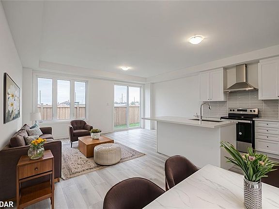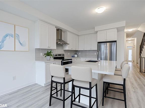 BRAND-NEW END UNIT TOWNHOME WITH MODERN UPGRADES & QUICK CLOSING AVAILABLE! Move right into this stunning brand-new end-unit townhome, part of the highly desirable Ventura South Townhome Collection, offering 1,650 sq ft of beautifully designed living space with 3 bedrooms and 3 bathrooms. Priced to sell and ready for quick closing, this home delivers exceptional value and peace of mind with a 7-year Tarion Warranty. Located near HWY 400, the South Barrie GO Station, walking and cycling trails, top-rated schools, shopping, and dining, with quick access to golf and Friday Harbour Resort offering year-round recreation. Curb appeal impresses with a charming covered front porch and a stylish front door with a frosted glass insert and transom window that fills the entryway with natural light. With no sidewalk in front, enjoy parking for two vehicles in the driveway. Upgraded laminate and tile flooring enhance the main level, laundry room, and bathrooms, offering durability and a modern aesthetic. The open-concept kitchen showcases quartz countertops, white cabinets, a tile backsplash, stainless steel chimney-style range hood, French-door refrigerator, electric range, dishwasher, and a large island with breakfast bar seating for five. The adjacent great room offers a bright, welcoming space with a walkout to the partially fenced backyard featuring wood privacy fencing along the rear and side lot lines and a convenient gate. Completing the main level is a powder room and a laundry room with garage access, a side-by-side Whirlpool washer and dryer, overhead storage cabinets, and a clothing rod. Upstairs highlights upgraded laminate flooring throughout the hall and bedrooms, a 4-piece main bathroom with a quartz-topped vanity, and a primary bedroom with two walk-in closets and a 3-piece ensuite. Central air conditioning, quality upgrades, and modern finishes throughout make this new #HomeToStay a standout choice in one of Barrie’s most convenient neighbourhoods!