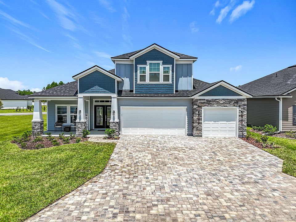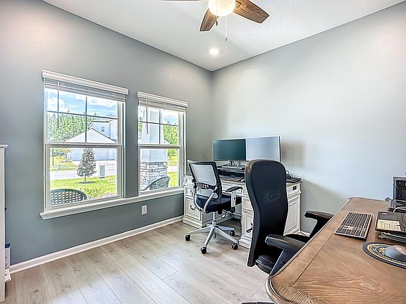 Over 3200sq ft with 5 bedrooms, 4 full bathrooms, a dedicated office/flex space, formal dining, and large finished upstairs living area. This one and a half story home with a spacious three stall garage is priced under appraised value! You’ll love the airy feel of the spacious great room, expanded tray ceilings, and natural light that pours in through the oversized three panel sliding door that tucks away out of sight allowing the living area to seamlessly flow to the outdoor space. Step outside to the covered lanai perfect for relaxing or entertaining. Beautiful and desired lot adjacent to two HOA owned green space parcels leaving no houses to one side and rear of the home! Engineered drawings are ready for permitting to install a 14’ x 30’ pool with screened enclosure. No CDD fee!