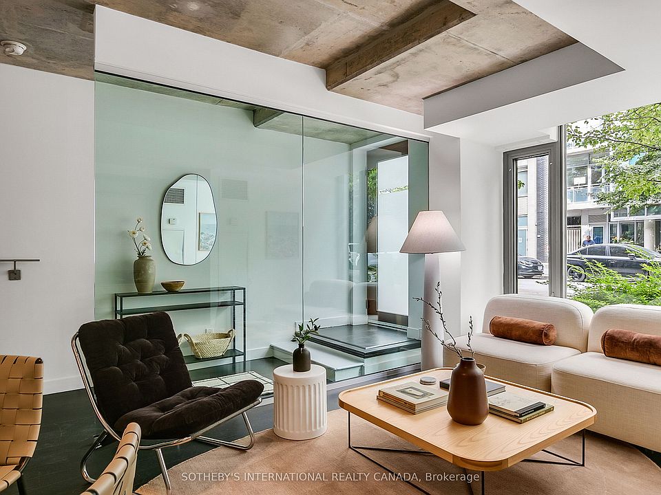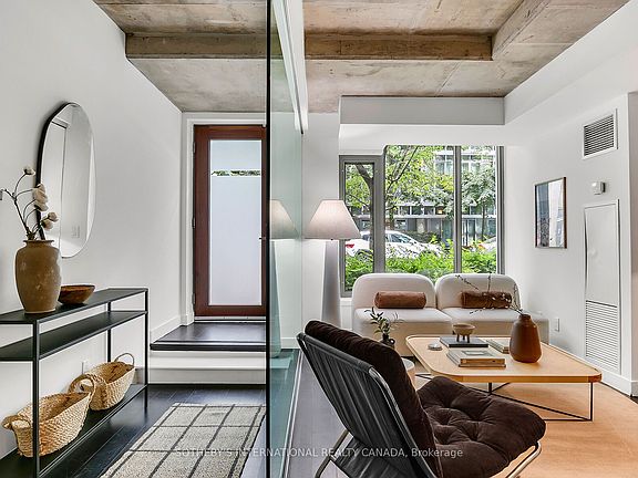 The ultimate, true live/work opportunity located in the heart of King West. Welcome to the Residences at 1 Hotel and specifically the townhomes addressed on Stewart St. #25 is 1410 square feet of exceptional proportions on two levels. A multi purpose living/ dining/work area with spacious kitchen on the main level. The second level boasts a large family/great room with two bedrooms, each with their own bathroom and good sized closets. Freshly painted, dark wood flooring throughout, some exposed concrete ceilings and large floor to ceiling north facing windows. An ideal opportunity for professionals and or creative entrepreneurs looking to be located in a lively and dynamic neighbourhood with easy access to all the daily amenities one requires, public transit, highways, Billy Bishop Airport, world class restaurants and cafes, entertainment and sporting venues.