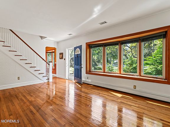 Upon entering, you'll be greeted by gleaming hardwood floors and an expansive eat-in kitchen, complete with radiant heated floors, ss appliances, a center island with granite countertops, ample room for hosting family gatherings or holiday celebrations. The dining room and living room boast bow windows, providing sweeping views of scenic Lincroft.