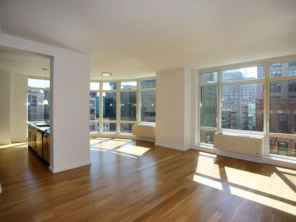 Stunning two-bedroom, two-bath home with a dramatic curved glass wall in the Great Room that makes a statement. Residence features southeast facing open Soho and Manhattan skyline views.Flowing and expansive great room features ten foot ceilings, wall of windows, and limed four inch solid white oak floors. The home is both luminous and loft-like, truly a stunning home. The kitchen features wood paneled built-in Subzero refrigerator, a 30 inch stainless steel Bertazzoni gas range, a Bosch stainless steel dishwasher, in-unit washer/dryer and an LG stainless steel microwave oven. The bathrooms feature an oversized, limed white oak vanity, Travertine slab countertops, tri-view mirrored medicine cabinet with integrated lighting, porcelain tiles, deep soaking tub, and separate stall showers with frameless glass shower doors. This first class boutique building features: 24-hour doorman, gym, sun deck, roof deck, high speed elevators, inviting magnificent lobby, laundry, and concierge services.