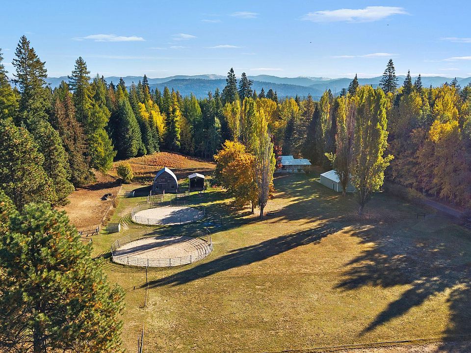 This easy living 18-acre estate known as The Equestrian Center is located in the desirable Selle Valley just north of Sandpoint with astounding views of Schweitzer Mountain Ski Resort. Prime location just off a county-maintained road surrounded by beautiful cedar forests and complemented by a sunny 5-bedroom home, shop/garage (36x48), hay barn, grooming shed & established gardens. Set up for eventing with 4 dressage & jumping arenas and conditioning track with pasture grazing and easy trailer turn arounds, and nearly invisible fencing. Acres of paddock turnout. Updated home offers main level living room with fireplace, kitchen/dining space with slider that opens to an amazing, covered deck, 3 bedrooms, 2 bathrooms, laundry room. Lower-level recreation room, 2 bedrooms, yoga room & 2 storage rooms. Updated windows, Oden water. Shop is roughed in for a bathroom providing versatile space for an office, studio, or even a future ADU. Idaho's picturesque landscaped 18 acres provides additional space for all your needs. Sandpoint, a Ski Mountain & Lake Community with stunning natural beauty and year-round recreation!
